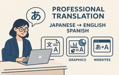 英語・スペイン語間の翻訳業務を行っております。ドキュメント、グラフィック、ウェブサイトなど、さまざまなコンテンツに対応可能です。
